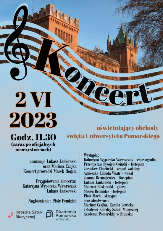 2 czerwca 2023 o godzinie 11:30, zaraz po oficjalnych uroczystościach, zapraszamy wszystkich na wyjątkowe wydarzenie - Koncert Celebrowania Uniwersytetu Pomorskiego. Wydarzenie to jest organizowane przez Katedrę Sztuki Muzycznej (KSM) Akademii Pomorskiej w Słupsku.