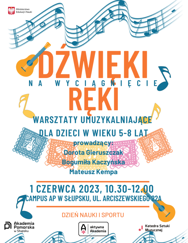 1 czerwca 2023 roku zapraszamy dzieci w wieku 5-8 lat na wyjątkowe warsztaty umuzykalniające, "Dźwięki na wyciągnięcie ręki". To unikalna okazja, by Twoje dziecko mogło odkryć magię muzyki pod okiem doświadczonych prowadzących - Doroty Gieruszczak, Bogumiły Kaczyńskiej i Mateusza Kempy, wykładowców Katedry Sztuki Muzycznej.