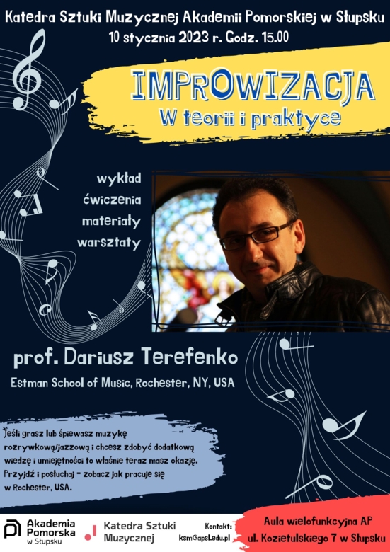 Katedra Sztuki Muzycznej Akademii Pomorskiej w Słupsku zaprasza 10 stycznia 2023 r. na wykład i zajęcia warsztatowe z improwizacji muzycznej, które poprowadzi prof. Dariusz Terefenko (wykład w języku polskim). Dariusz Terefenko jest profesorem w prestiżowej Eastman School of Music (Rochester, NY, USA), gdzie wykłada na dwóch wydziałach: Jazz and Contemporary Media oraz Music Theory.