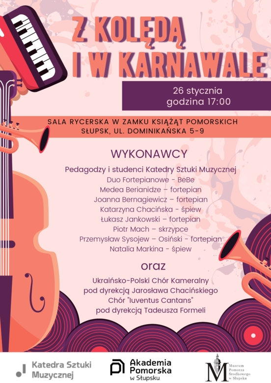 26 stycznia 2023 roku (czwartek) o godzinie 17:00, w Sali Rycerskiej w Zamku Książąt Pomorskich w Słupsku (ul. Dominikańska 5-9) odbędzie się koncert "Z kolędą i w karnawale", w którym wystąpią pedagodzy i studenci Katedry Sztuki Muzycznej Akademii Pomorskiej w Słupsku.
